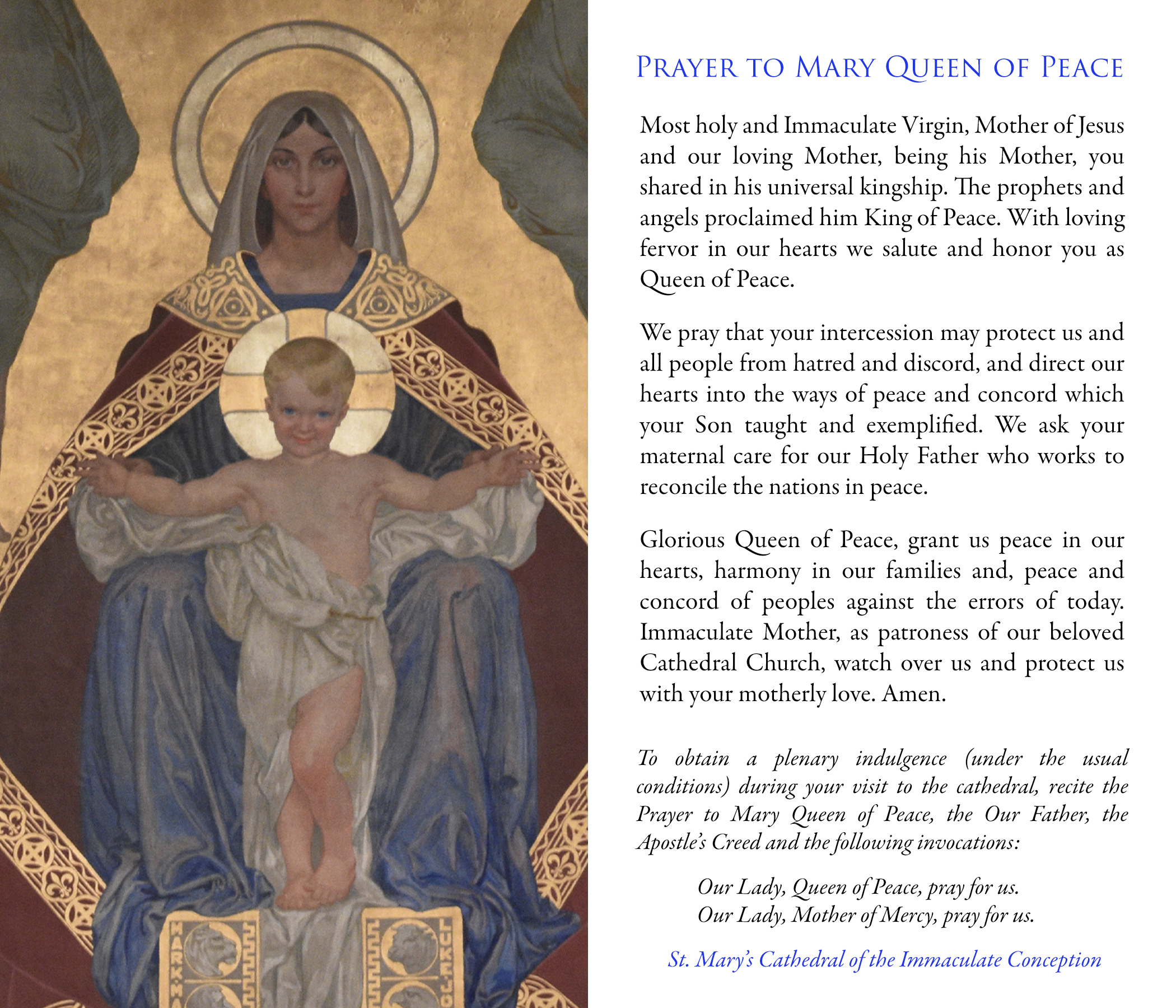 The Apostolic Penitentiary, whose role is to properly regulate all matters concerning the granting and use of indulgences to increase the faith and salvation of the faithful, by virtue of the special faculties granted to it by the Most Holy Father in Christ and Our Lord, Pope Leo XIV, Minister of our faith and joy, in response to the petitions presented by His Excellency Lord Alexander King Sample, Archbishop Metropolitan of Portland in Oregon, on the occasion of the centennial anniversary of the consecration of the Cathedral Church under the title of the Immaculate Conception of the Blessed Virgin Mary, out of the immense mercy of God and the heavenly treasures of the Church, graciously grants a plenary indulgence under the usual conditions (sacramental confession, Eucharistic communion, and prayer for the intentions of the Supreme Pontiff) to all faithful Christians who are truly penitent and moved by charity, from February 14, 2026, until February 13, 2027. This indulgence may also be applied, by way of suffrage, to the souls of the faithful detained in Purgatory, provided they visit the Cathedral of the Immaculate Conception of the Blessed Virgin Mary in the form of a pilgrimage and participate devoutly in the jubilee rites there, or at least spend a suitable amount of time in pious reflection, prayer, or other works of Christian devotion for the glory of God, and offer prayers to God for peace and the concord of peoples against the errors of the present day, concluding with the Lord’s Prayer, the Creed, and invocations to the Blessed Virgin Mary, Queen of Peace, Mother of Mercy.